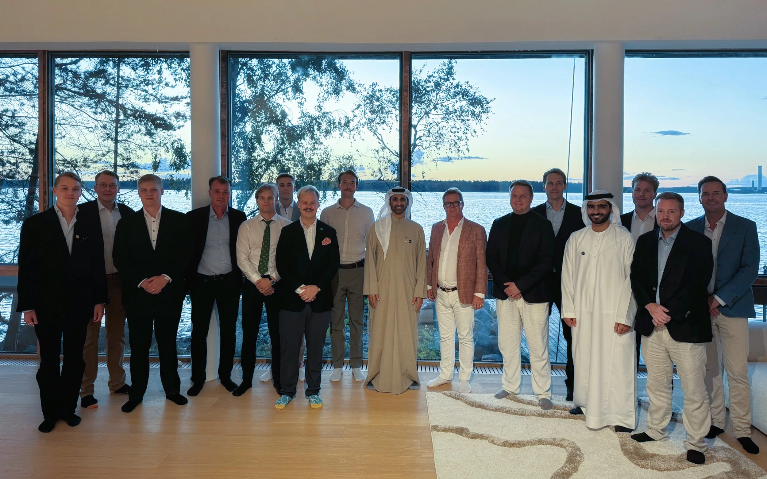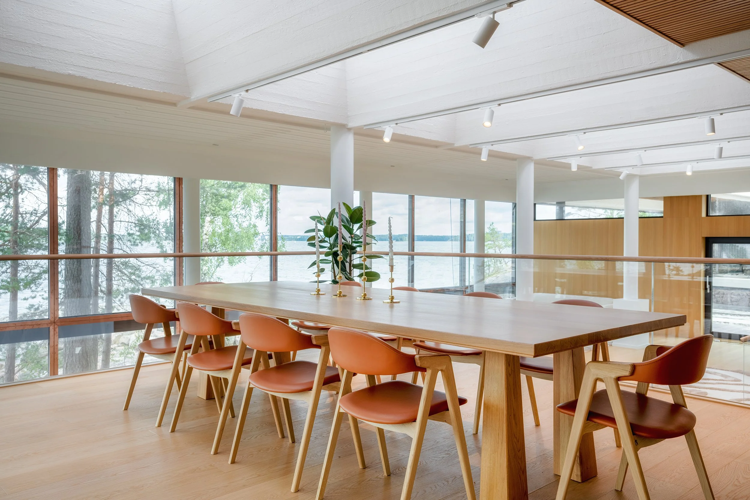 Moderni ruokailutila, jossa pitkä pöytä ja näkymät merelle isoista ikkunoista. Sopii yhteisiin illallisiin, juhlahetkiin tai tyylikkääseen kokouslounaspöytään