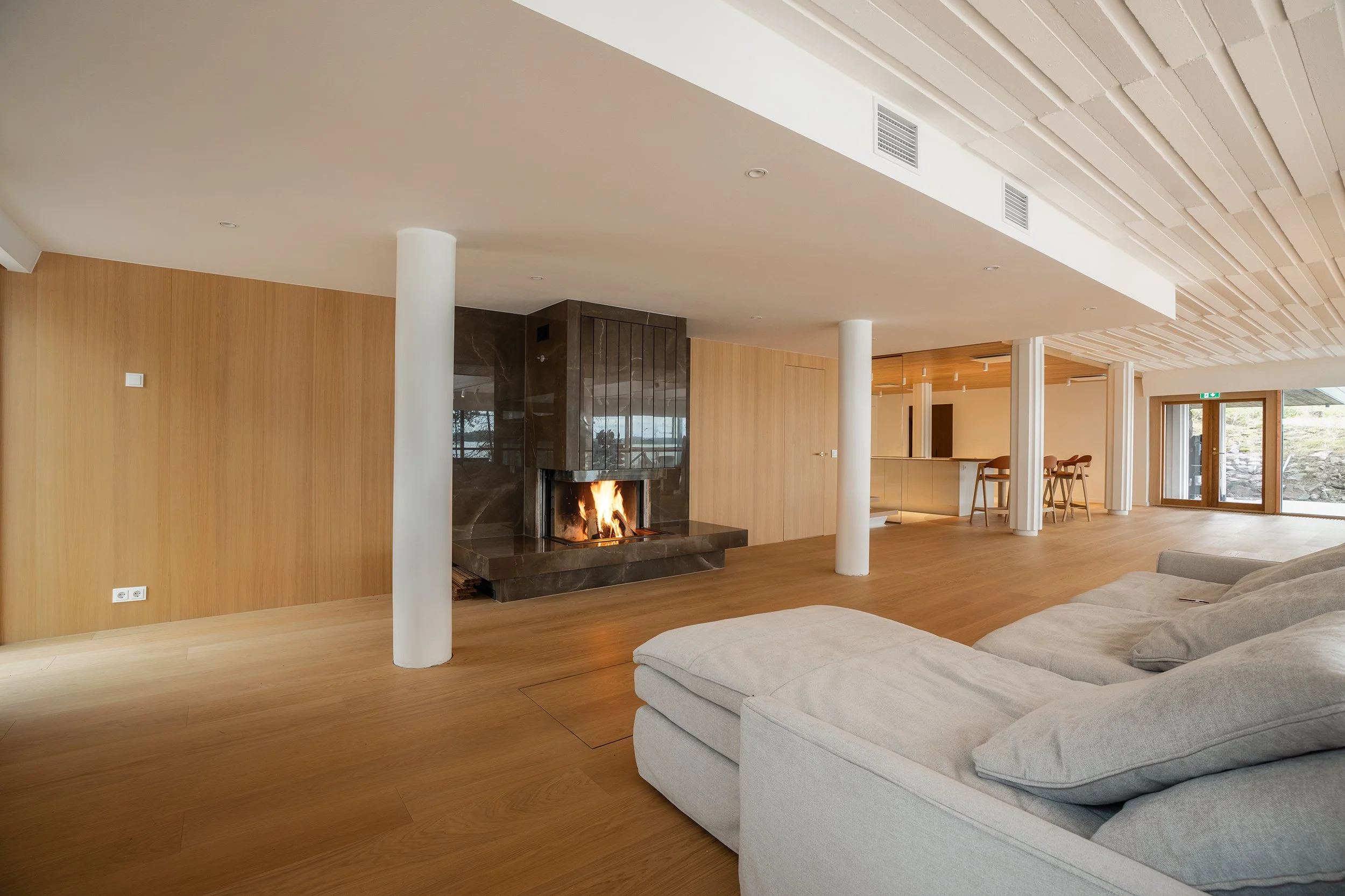Rento oleskelutila, jossa mukavat sohvat ja takka luovat lämpimän tunnelman. Täydellinen verkostoitumiseen, keskusteluihin ja vapaamuotoisiin hetkiin ohjelman lomassa.